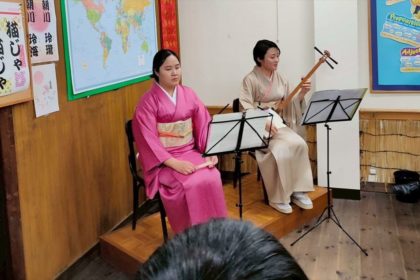 会場は、外国人の方も多く、二人は端唄の演奏の他、端唄の説明や台湾の話などを英語で説明。お座敷遊びの「金毘羅船々」を三味線の演奏で体験し、会場はにぎやかな笑いの渦につつまれました。